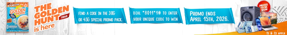 The Golden Hunt runs till 15 April 2026, and is available on special 30g and 45g promo packs. Every pack contains a unique code giving consumers the chance to win exciting prizes, including airtime, cash rewards, laptops, phones, TVs, and washing machines, from a prize pool worth over ₦80 million.