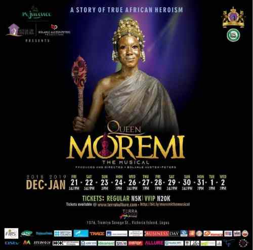 From the producers and directors of Saro the musical, Wakaa the musical and Fela and the Kalakuta Queens, Bolanle Austen-Peters production and the House of Oduduwa bring you Queen Moremi the musical. The legendary story if bravery love, pain and ultimate sacrifice. Breathtaking drama.